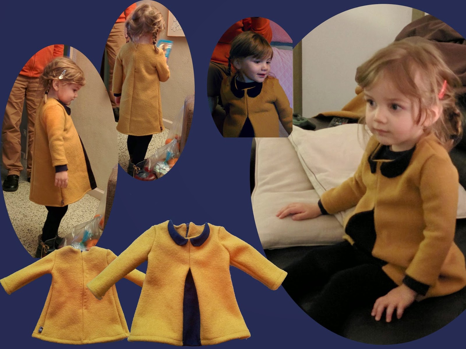 Soit! Ik had het al eerder eens koud : Koud koud koud... toen ik een winterjas aan het maken was. Van de stof van die winterjas had ik nog een restje stof over. Ik maakte er al een cape voor Emmy & Warre's nichtje Syenna mee, maar het restje was blijkbaar eerder een rest dus ontwierp ik een patroontje om daar iets mee te maken! Ik zag ergens in een vitrine een okergele jurk gecombineerd met een blauw kolletje en dit smolt samen met een patroon die ik in LMV (la maison victor) had zien passeren nl. de birdiedress. Ik paste het patroon iets aan en tekende het aan de hand van mijn basispatroontje en kon zo nog drie jurkjes maken! En nu is de stof op! (allé op een klein vierkantje dat ik uiteraard nog steeds niet kan weggooien)